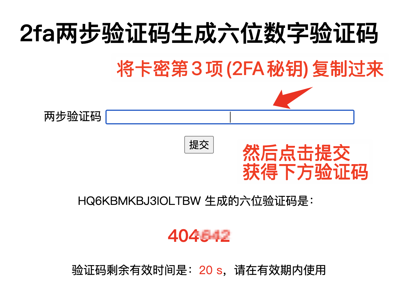 3. 去网址 2fa.show,复制卡密第3项(2FA秘钥),生成六位数字验证码